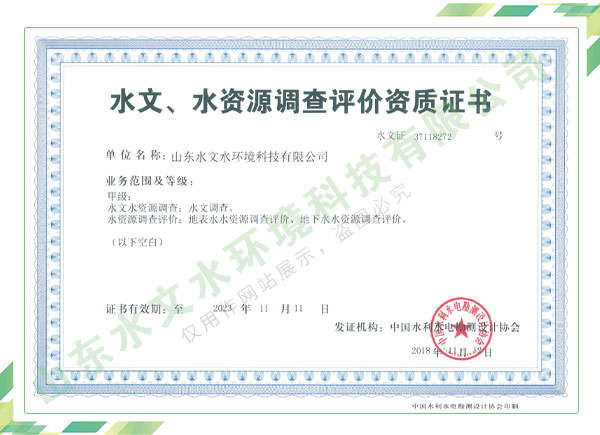 公司擁有水利工程設(shè)計、水土保持、水文水資源調(diào)查評價、水資源論證、建設(shè)項目環(huán)境影響評價、市政公用工程施工總承包、水利水電工程施工總承包、電子與智能化工程專業(yè)承包等資質(zhì),2017年通過質(zhì)量管理體系、環(huán)境管理體系、職業(yè)健康安全管理體系認(rèn)證;2020年被評為國家級高新技術(shù)企業(yè),同年被中國水利企業(yè)協(xié)會推薦為第一批“合同節(jié)水服務(wù)企業(yè)”;2021年被山東省、濟南市評為 “專精特新”中小企業(yè)。業(yè)務(wù)范圍涉及水利工程設(shè)計;節(jié)水設(shè)計、改造、水平衡測試;山洪災(zāi)害調(diào)查;城市水資源調(diào)查評價;建設(shè)項目水土保持方案編制、監(jiān)測、驗收、水土保持規(guī)劃;水安全保障規(guī)劃、建設(shè)項目水資源論證、規(guī)劃水資源論證;建設(shè)項目環(huán)境影響評價;入河排污口論證;防洪影響評價;市政公用工程施工、水利水電工程施工、電子與智能化工程施工等。
